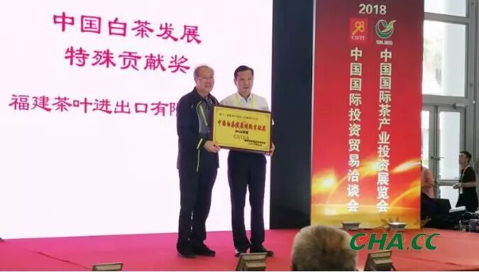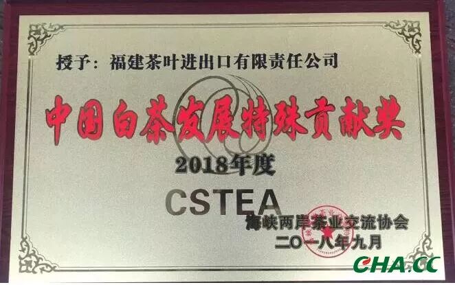 2018年9月8日上午,在剛剛舉行的中國(guó)國(guó)際茶產(chǎn)業(yè)投資展覽會(huì)(“9·8茶博會(huì)” )上,海峽兩岸茶業(yè)交流協(xié)會(huì)為促進(jìn)我國(guó)茶產(chǎn)業(yè)發(fā)展和茶文化繁榮,提高中國(guó)白茶品牌市場(chǎng)競(jìng)爭(zhēng)力,評(píng)選頒發(fā)了2018年“中國(guó)白茶十強(qiáng)企業(yè)”,同時(shí)鑒于福建茶葉進(jìn)出口有限責(zé)任公司(以下簡(jiǎn)稱(chēng)中茶福建公司)新中國(guó)成立以來(lái)68年經(jīng)營(yíng)白茶的歷史、規(guī)模、傳承,在國(guó)內(nèi)外市場(chǎng)的影響力與在消費(fèi)者心目中的地位,以及為中國(guó)白茶和福建白茶所做出的突出貢獻(xiàn),決定專(zhuān)項(xiàng)設(shè)立并頒發(fā)給中茶福建公司“中國(guó)白茶發(fā)展特殊貢獻(xiàn)獎(jiǎng)”。