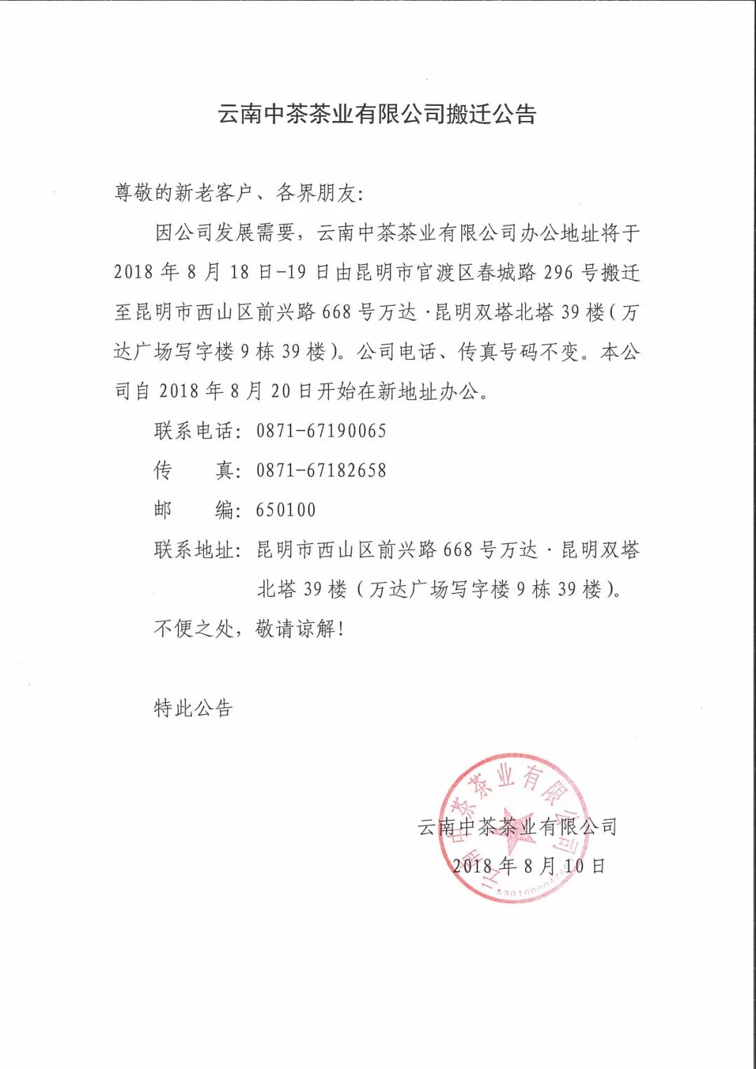因公司發(fā)展需要,云南中茶茶業(yè)有限公司決定搬遷至昆明市西山區(qū)前興路668號萬達(dá)·昆明雙塔北塔39樓(萬達(dá)廣場寫字樓9棟39樓)。8月18日~19日為搬遷時間,自8月20日起,公司正式在新址辦公。