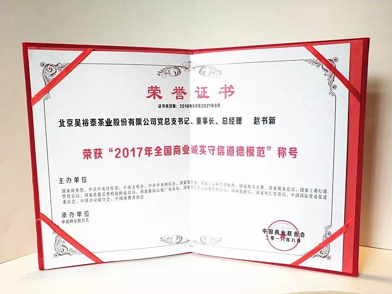 吳裕泰黨總支書記、董事長、總經(jīng)理趙書新榮獲“2017年全國商業(yè)誠實守信道德模范”稱號