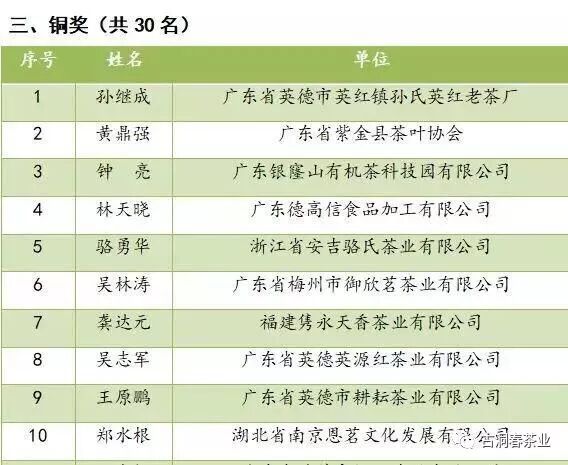 2018首屆全國紅茶加工制作大賽金、銀、銅獎獲獎名單。(金獎10名,銀獎20名,銅獎30名,優(yōu)秀獎50名)