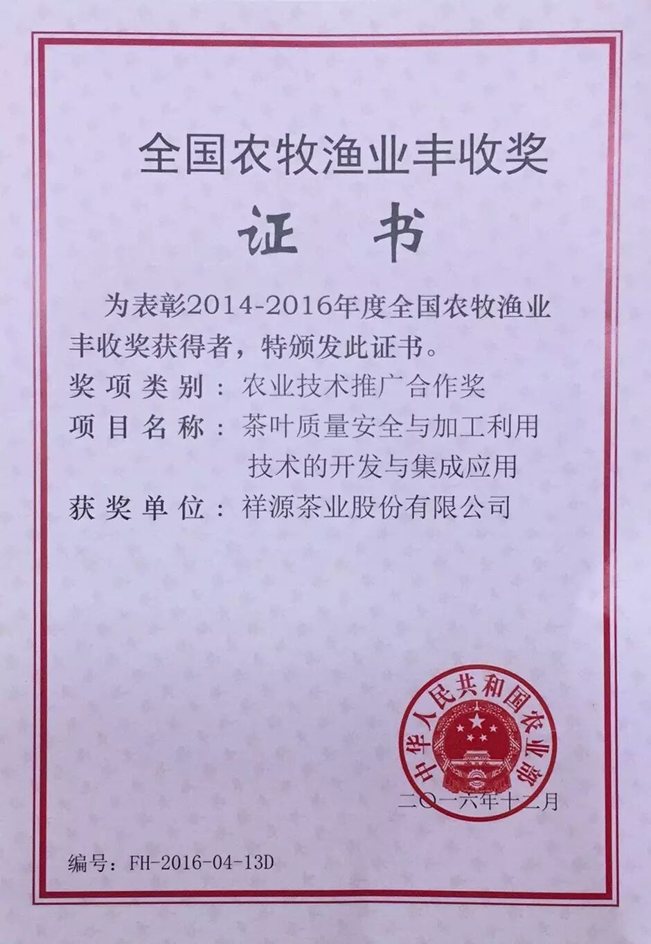 近日,從國家農(nóng)業(yè)部傳來喜訊,由祥源茶業(yè)股份有限公司實(shí)施的《茶葉質(zhì)量安全與加工利用技術(shù)的開發(fā)與集成應(yīng)用》項目榮獲2014-2016年度全國農(nóng)牧漁業(yè)豐收獎,該獎項屬農(nóng)業(yè)技術(shù)推廣合作獎。