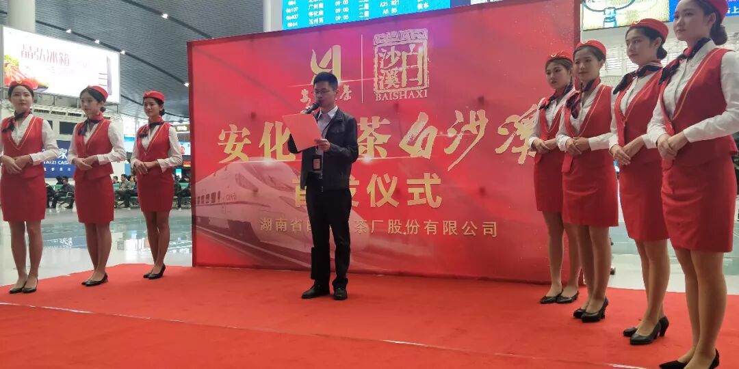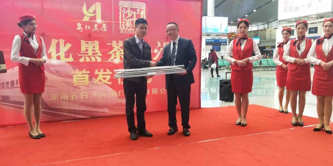 在星城長沙高鐵站候車室的首發(fā)儀式現(xiàn)場,湖南省白沙溪茶廠股份有限公司副總經(jīng)理孟濤、廣鐵集團(tuán)列車分公司總經(jīng)理趙軍興先生、華鐵傳媒集團(tuán)有限公司副總裁程碩先生分別做了致辭,并為安化黑茶白沙溪號(hào)高鐵列車首發(fā)剪彩。隨后參會(huì)的各位嘉賓來到站臺(tái)共同見證了安化黑茶白沙溪號(hào)品牌專列正式發(fā)車前往深圳。