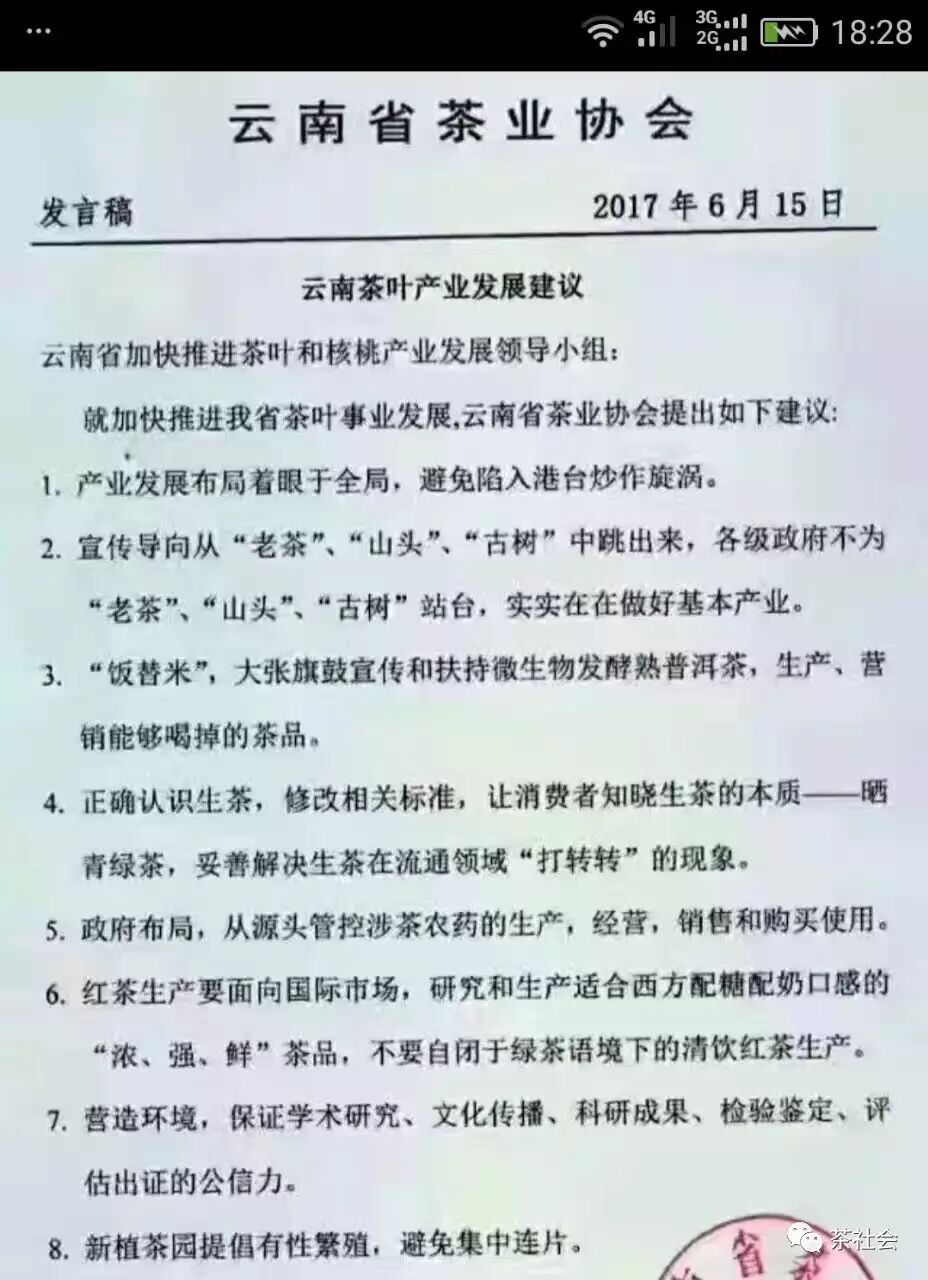 昨天下午,拿到蓋章的XX省茶協(xié)“XX茶葉產(chǎn)業(yè)發(fā)展建議”的發(fā)言稿,依我的工作經(jīng)驗判斷,這是在某相關(guān)工作研究會議上發(fā)言后,提交給上級起草重要文件用的附件。我讀后,覺得這家省茶協(xié)頗有擔(dān)當(dāng)。于是,試解讀如下: