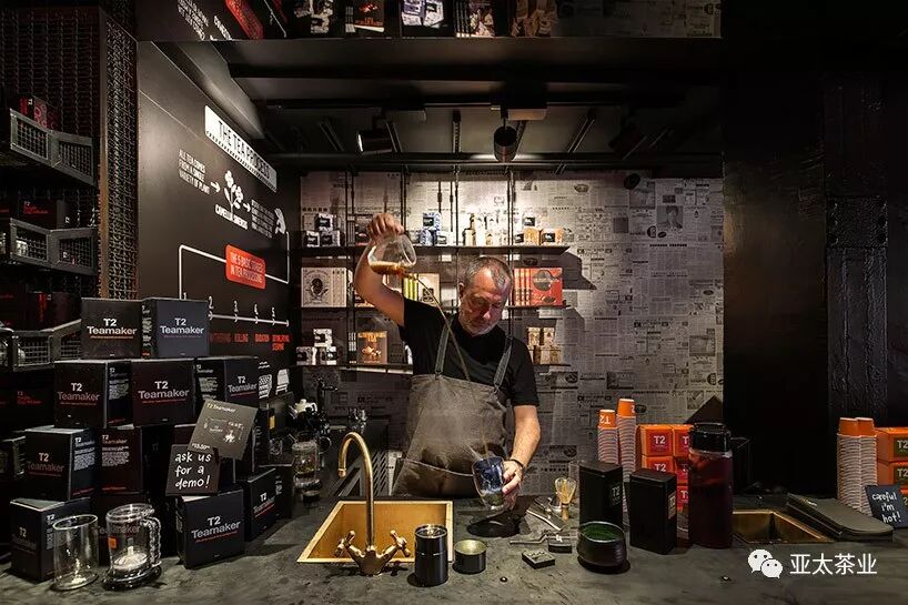 改變從色調(diào)開始,T2每家店以黑色木質(zhì)墻面為基調(diào),墻上增添中文舊報(bào)紙?jiān)兀瑏碚宫F(xiàn)茶文化起源。