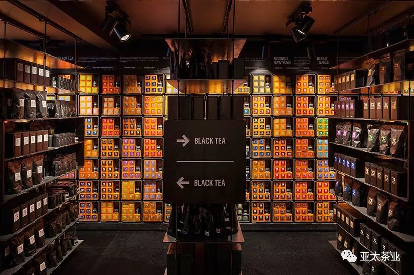 借助中藥鋪靈感,設(shè)計(jì)幾乎占滿整面墻的黑色方格架。每個(gè)小格子上放了形形色色的茶葉或者茶具,并還有黑色標(biāo)簽來識(shí)別不同茶葉品種。