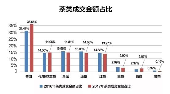 根據(jù)往年數(shù)據(jù)顯示,2017年茶葉成交金額比例相較于2016年,普洱茶、白茶、花草茶及再加工茶呈上升趨勢,其中,普洱茶依然位列第一,較2016年提高4.24%?。白茶較2016年提高0.5%,花草茶及在加工茶提高0.36%?。不難看出,近年來,隨著茶葉“收藏?zé)帷?、“投資熱”的興起,普洱、白茶這些具有收藏屬性的茶葉受到越來越多消費者的青睞??梢灶A(yù)見,今年雙十一期間,普洱、白茶、黑茶這些具有收藏屬性的茶葉依然會是賣點之一。