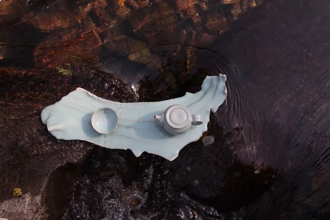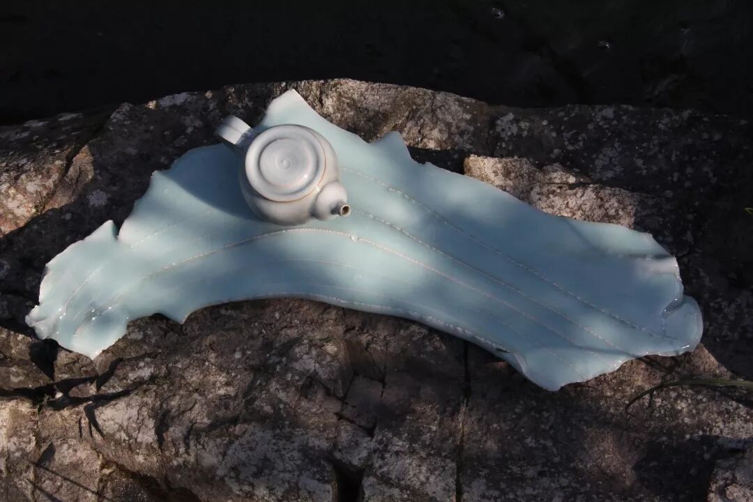 茶具“自在”這一組是2018年暑期在龍泉完成,以龍泉朱砂泥配傳統(tǒng)青釉表達(dá)當(dāng)代陶藝的對(duì)泥性思考。