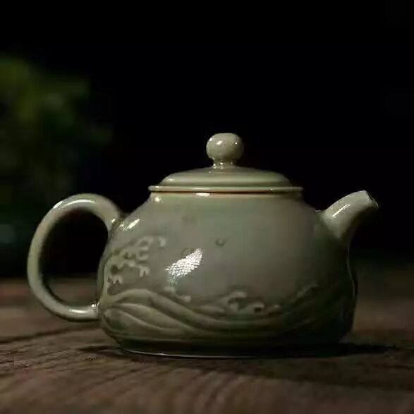 該壺型小巧精致,壺身刻畫海浪圖形,江崖海水是中國的一種傳統(tǒng)紋樣,此作品寓乘風(fēng)破浪之美意。