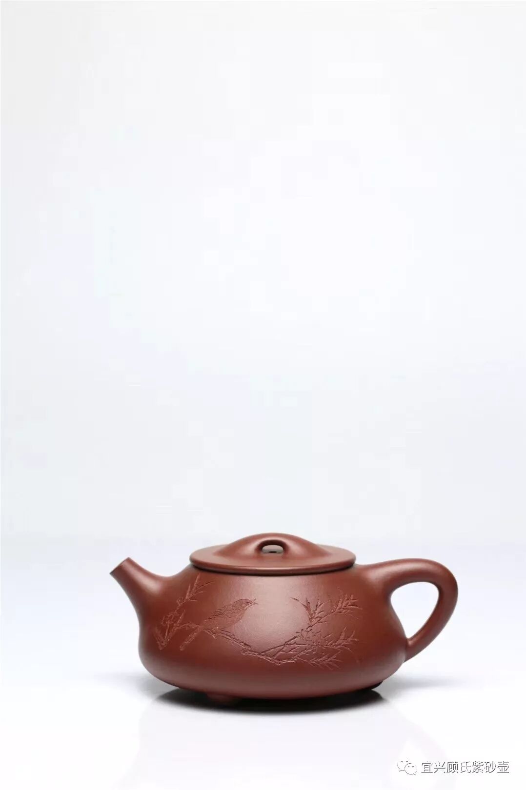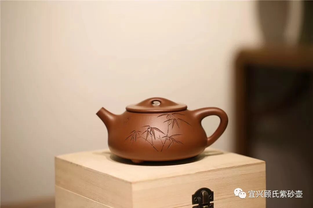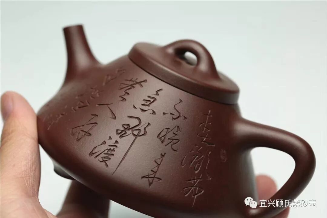 景舟石瓢:線條比較飽滿,底部和腹部是小弧面,連成較為圓滑的圓錐體,壺口較大,降低了總體重心,產(chǎn)生一種橫向感覺。