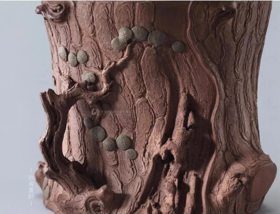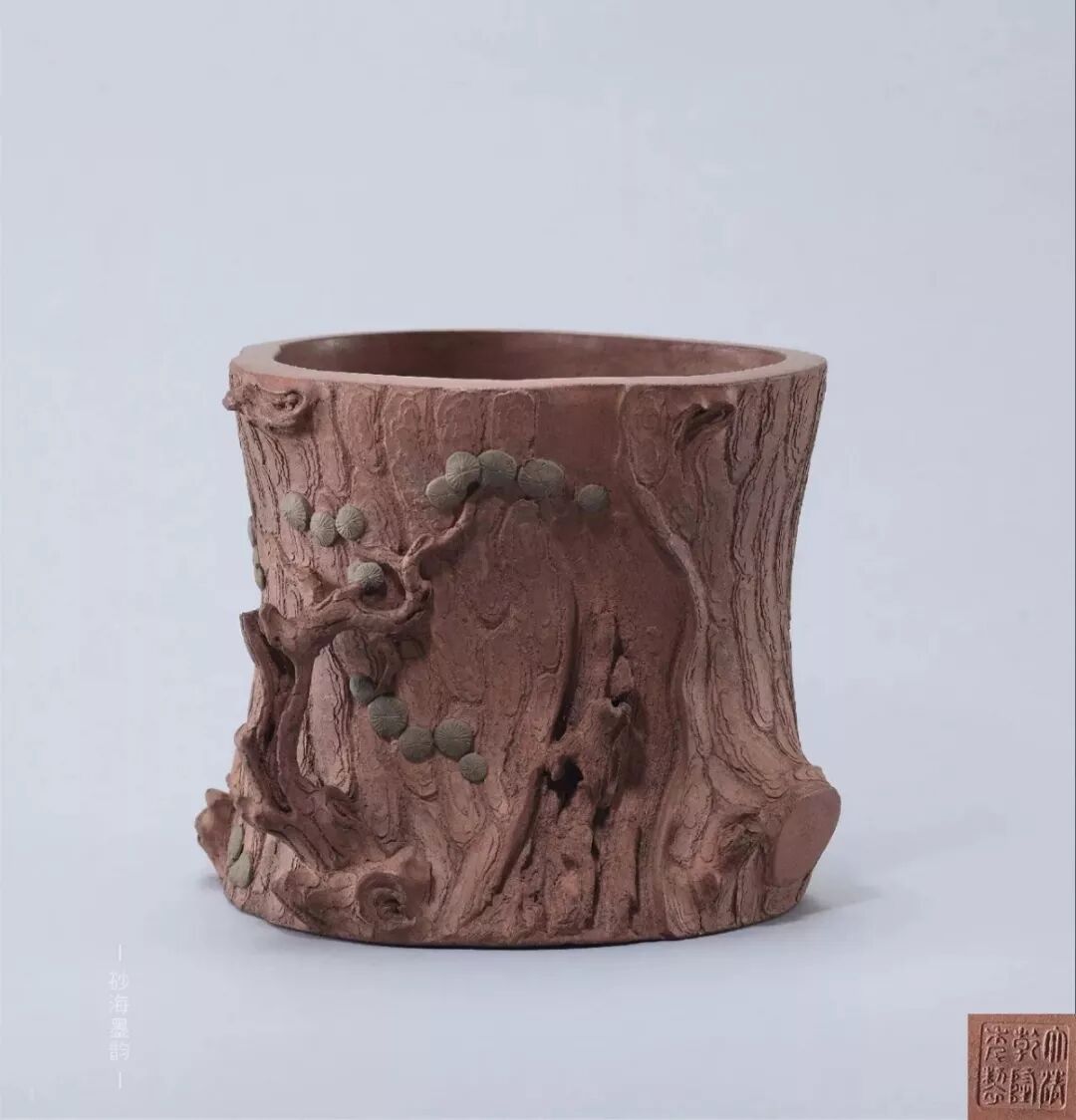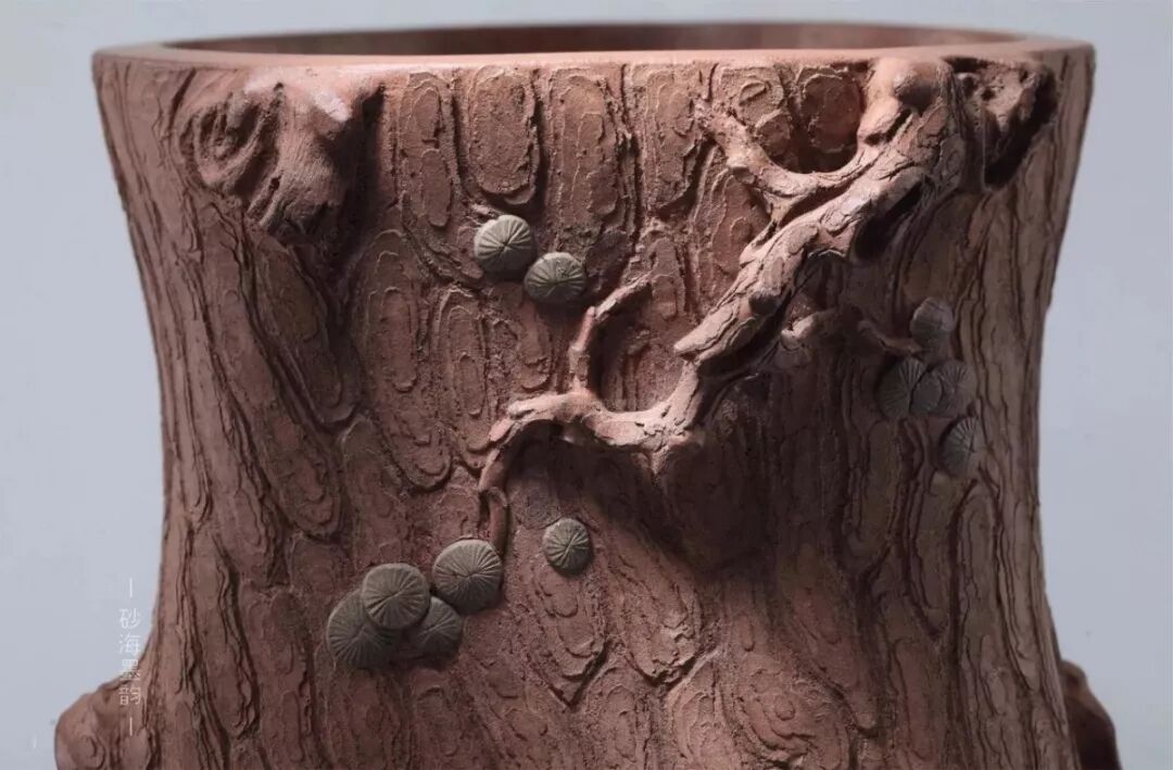 紫砂中自然也不缺對松的詮釋,無論是超寫實(shí)的表現(xiàn)其斑駁肌理的效果,還是詮釋其傲人的風(fēng)骨,都尤其出彩。