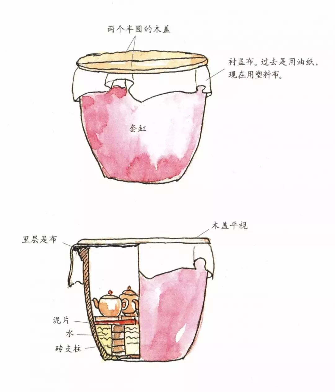 套缸,下半段隔層下存水,與上半層有小孔相通,缸蓋上用油紙、塑料布封蓋,下襯一層薄布,防止塑料吸濕成水滴往下掉。