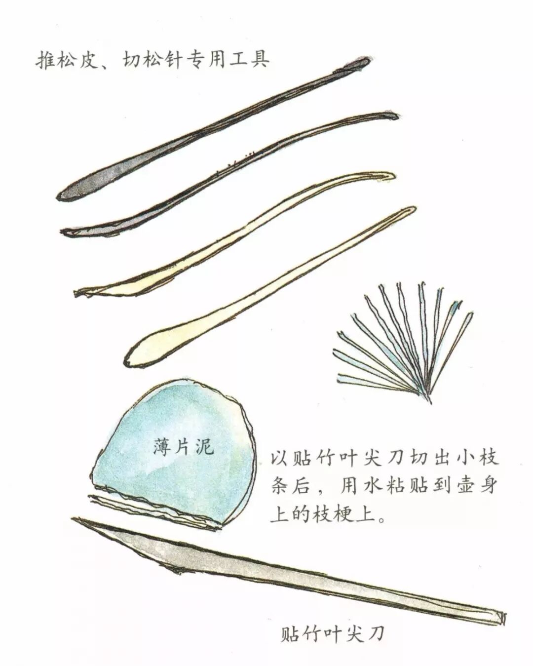 松樹的小枝條,以貼竹葉的尖刀切出,用水粘貼到松干的枝梗上。