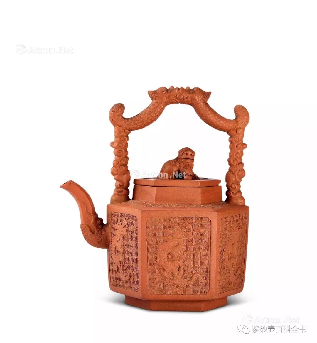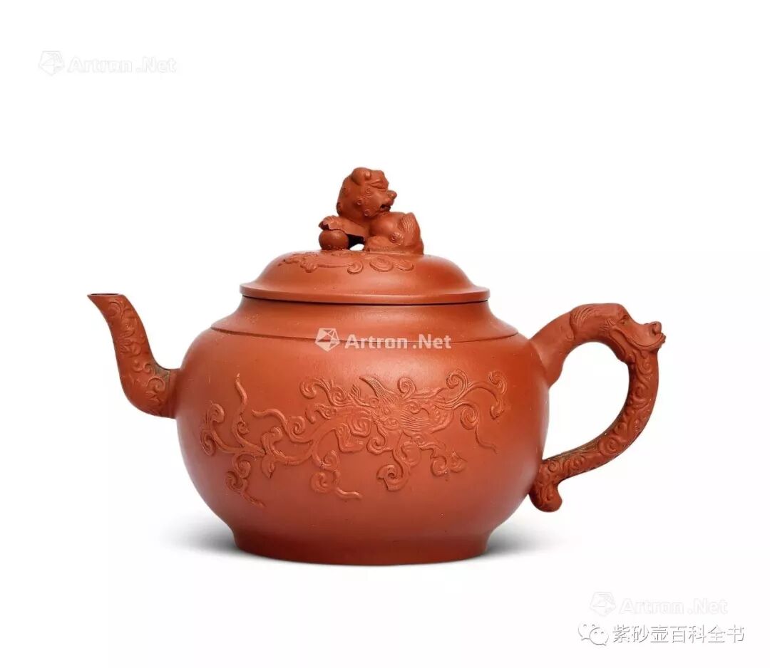 2208 清中期 朱泥貼塑螭龍紋獅鈕蓋壺