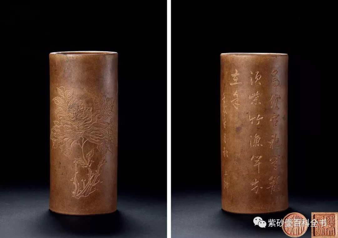 5067 民國(guó) 陳文居制并刻牡丹圖段泥筒瓶