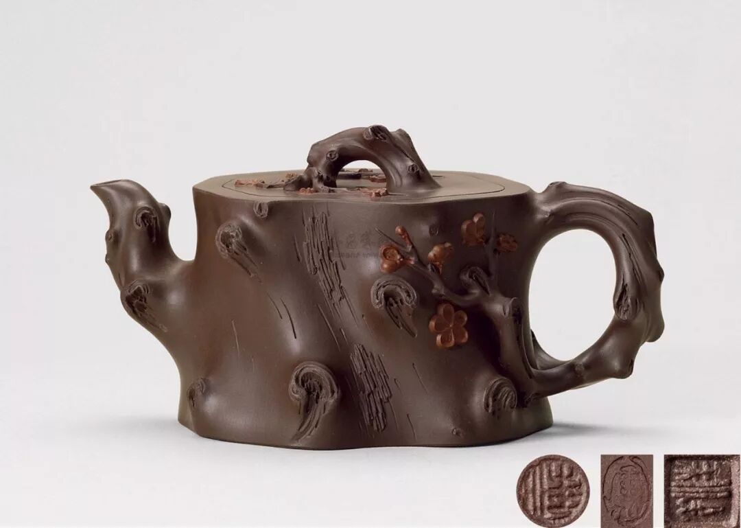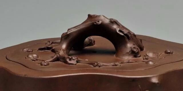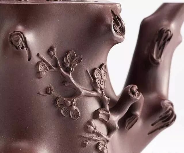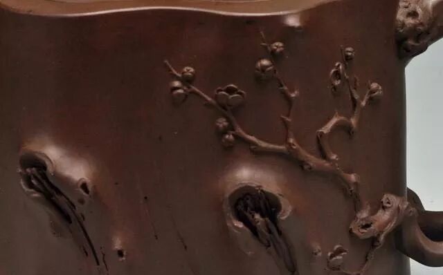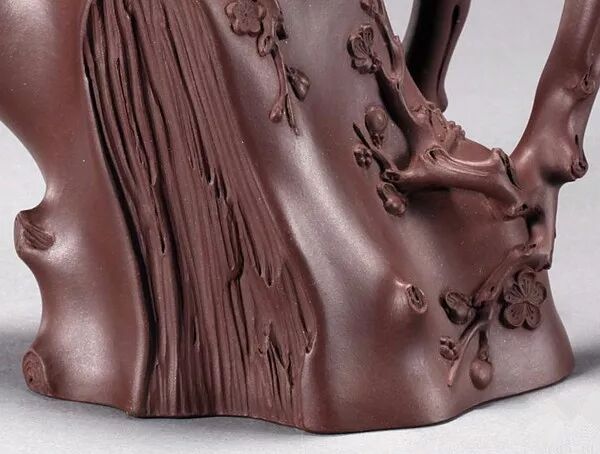 由梅樁底部向上伸展胥出梅枝有二:一向外上挺直成壺流,一向外彎成壺鋬,流鋬相互呼應(yīng)。