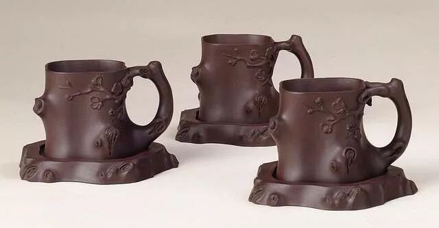 四只梅樁杯造型相似,均有杯柄,挺拔富有力度,柄上部亦有類似枝頭梅花。杯托為一扁平凹形梅段,與梅樁杯造型和諧。
