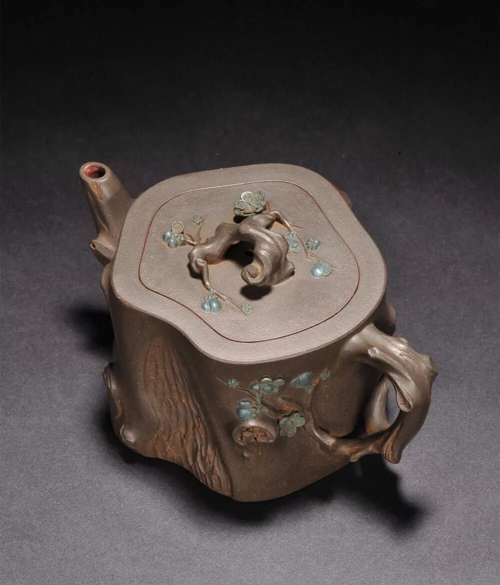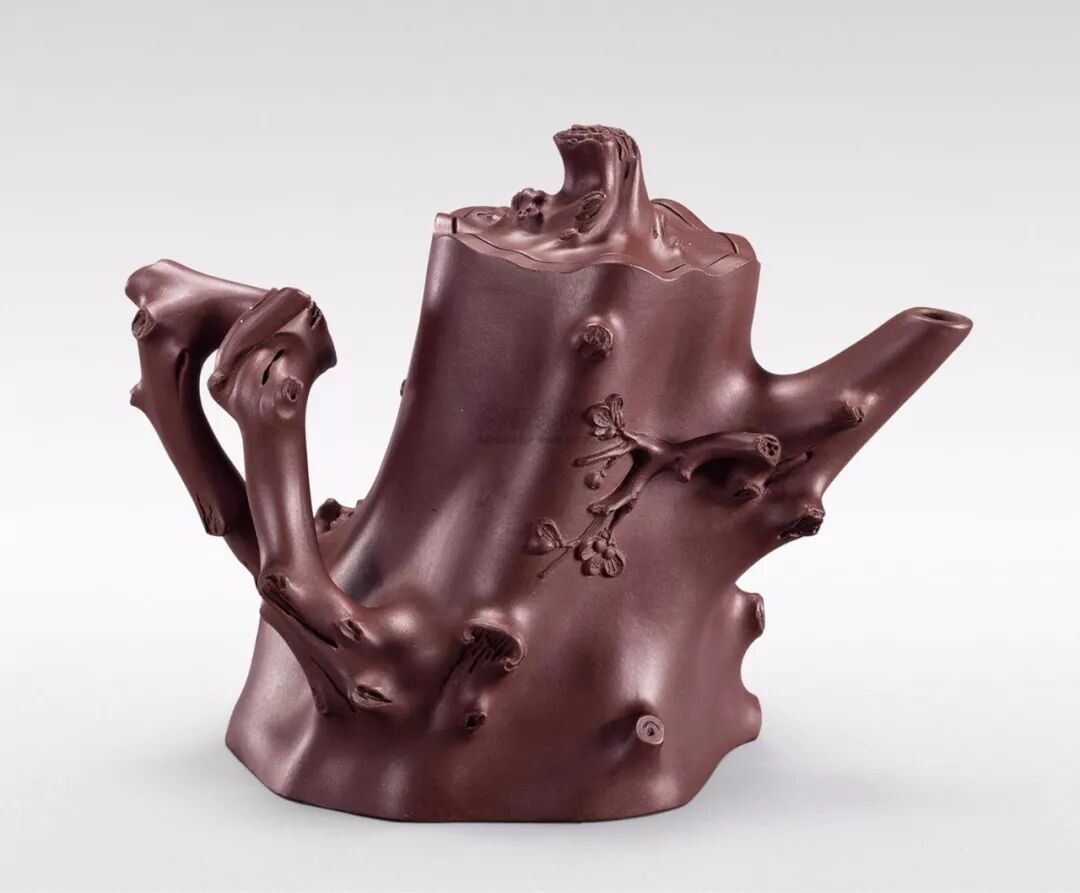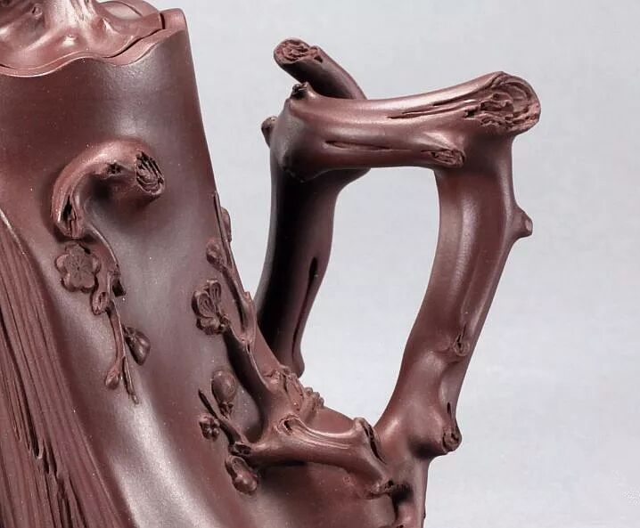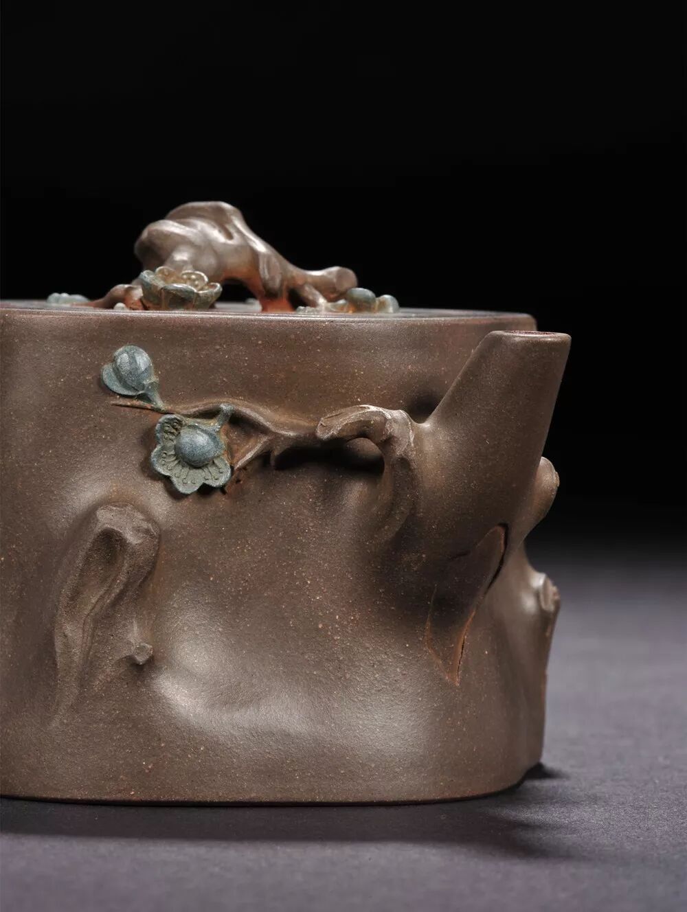 壺身一面飾斑斑蒼老的節(jié)疤和經(jīng)風(fēng)暴撕裂的樹(shù)皮,另一面,歷經(jīng)剪枝,光潤(rùn)堅(jiān)挺。壺嘴猶如右下向上伸展的梅枝,生意盎然。