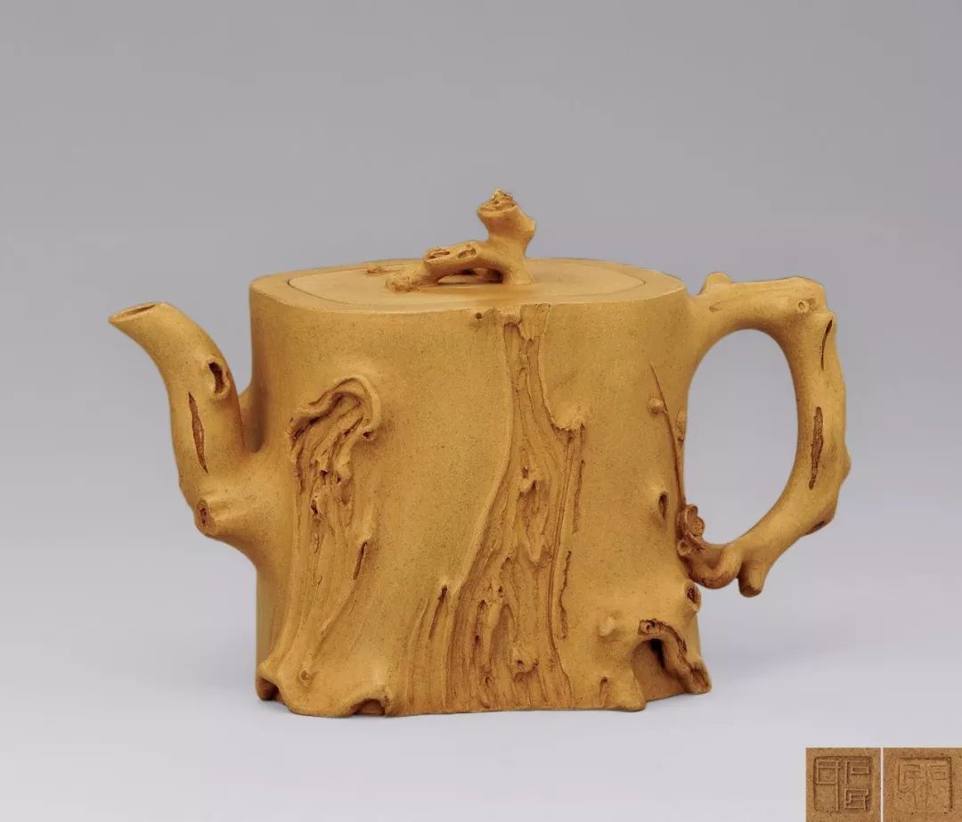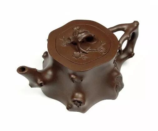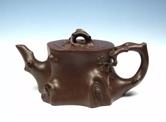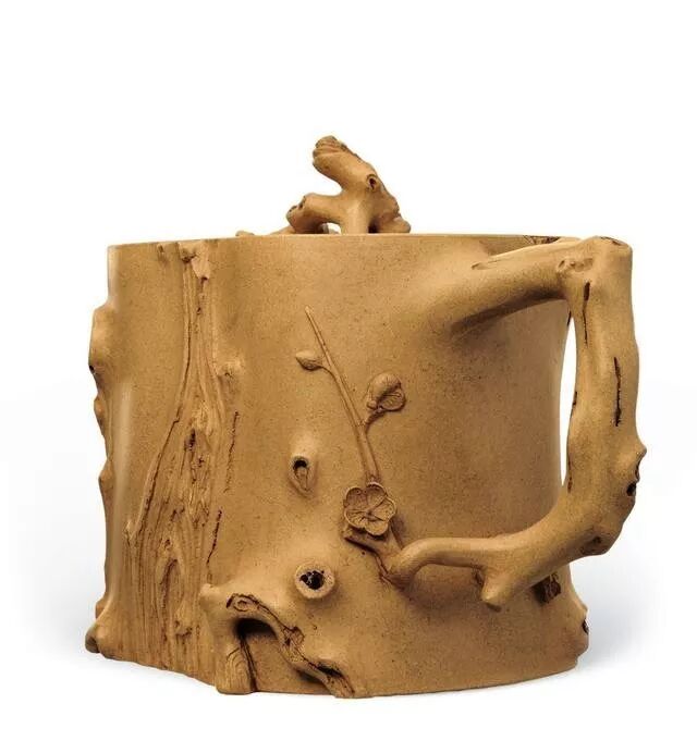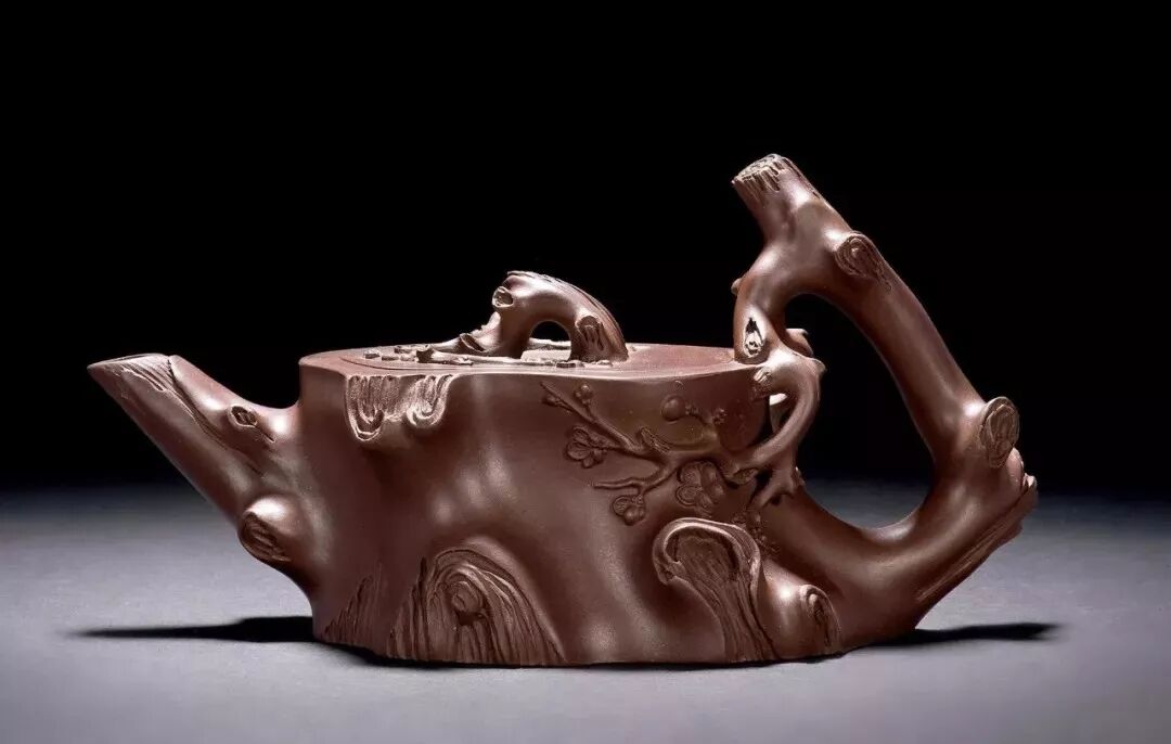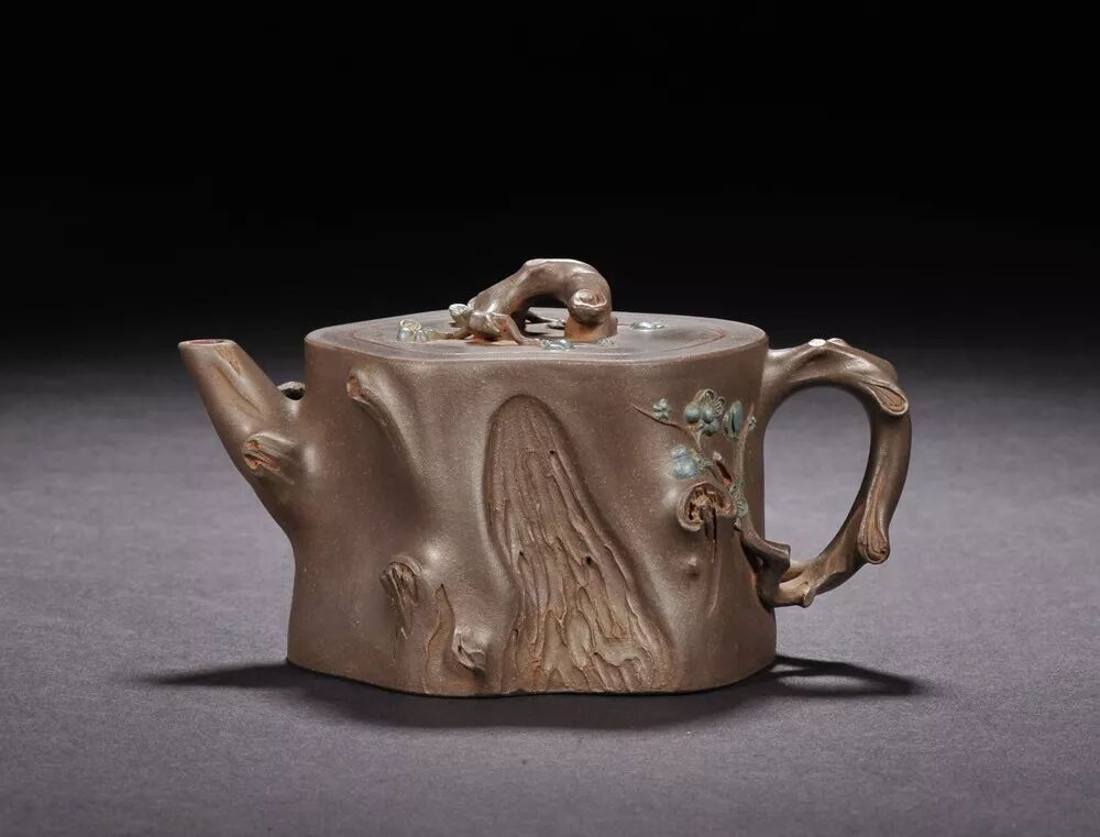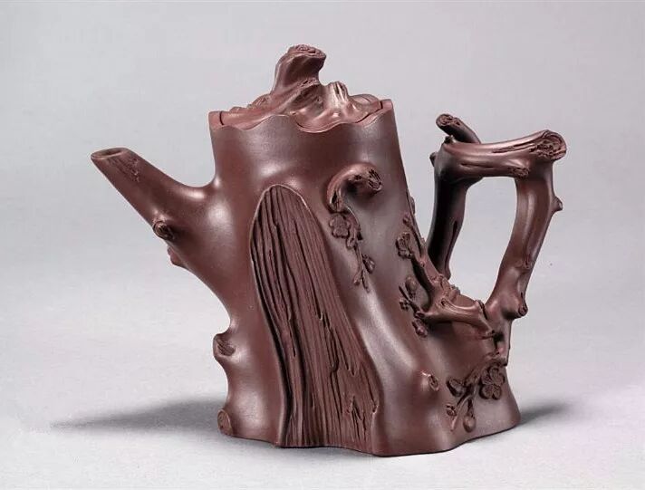 壺身一面飾斑斑蒼老的節(jié)疤和經(jīng)風(fēng)暴撕裂的樹(shù)皮,另一面,歷經(jīng)剪枝,光潤(rùn)堅(jiān)挺。壺嘴猶如右下向上伸展的梅枝,生意盎然。