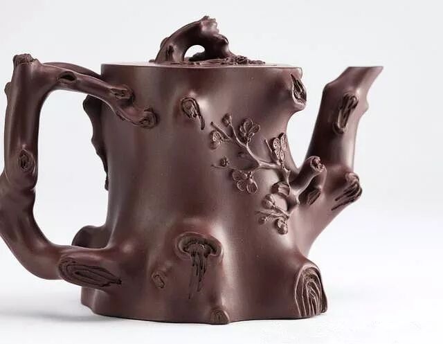 梅樁壺,是紫砂花貨的經(jīng)典名品。梅樁壺,以一段梅花樹(shù)樁為造型,以寫(xiě)實(shí)的手法,通過(guò)運(yùn)用各種雕塑技法,展現(xiàn)梅樁老干遒勁斑駁的肌理,梅枝傲骨、梅花凌寒綻放的不屈與高潔,使梅花之鐵骨冰姿引起觀者共鳴,感悟生命的氣魄。