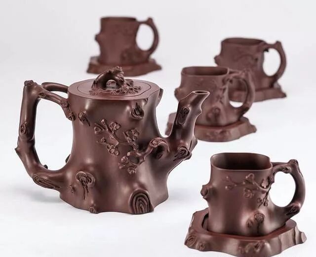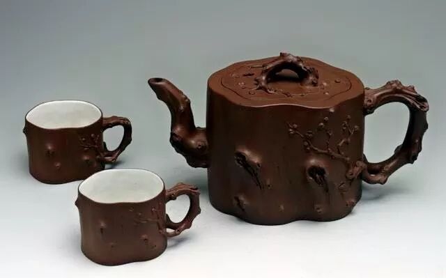壺為古梅梅樁造型,壺體為一不規(guī)則若圓筒形的梅樹(shù)樁,結(jié)疤錯(cuò)落有致,或凸起或斑斑駁駁。通體觀之,梅樁茶具剛勁有力,比例協(xié)調(diào),氣韻渾樸,一派天成。
