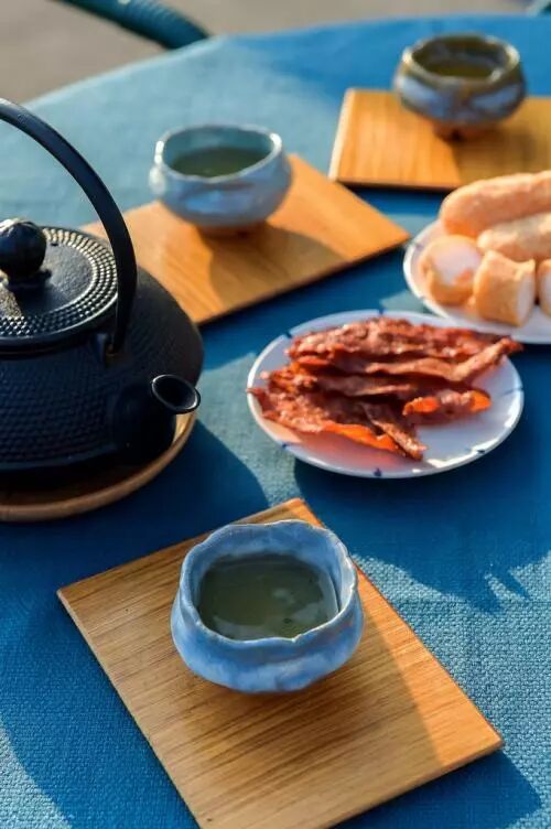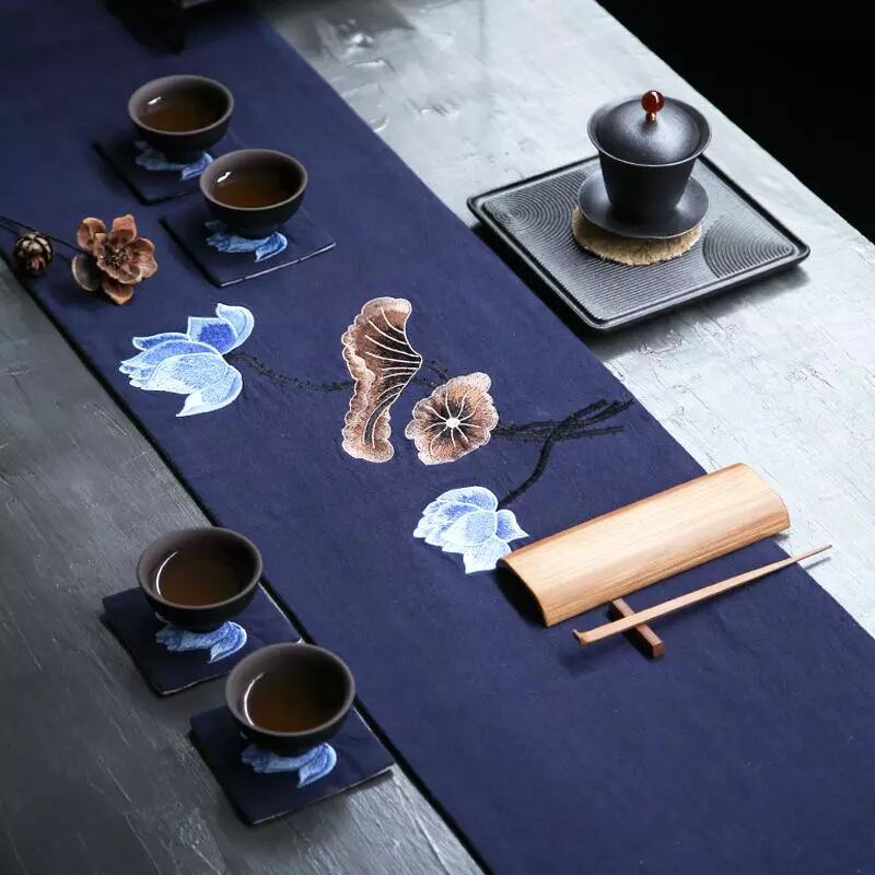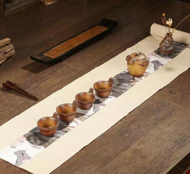 鋪墊的質(zhì)地、款式、大小、色彩、花紋的選擇,應(yīng)根據(jù)茶席設(shè)計的主題與立意要求,以對稱、烘托、反差、渲染等手段加以表達,或鋪桌上,或攤地下,或搭一角,或垂另隅,既可作流水蜿蜒之意象,又可如綠草茵茵之聯(lián)想。