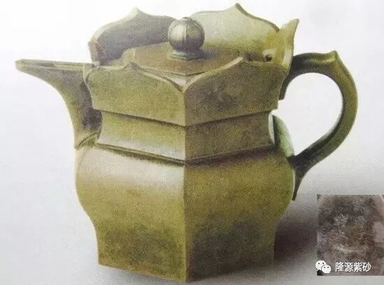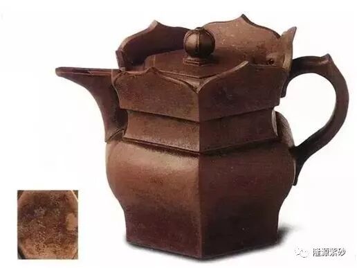 僧帽壺其造型因壺口形似僧帽而得名,壺身為六角形。壺身口沿處延伸出五瓣蓮花,壺蓋呈正六邊形,邊緣隱現(xiàn)于花瓣之中。壺鈕則為佛球狀,猶如僧帽之頂,風(fēng)格優(yōu)雅悅目、樸拙堅(jiān)致;壺頸緊接花瓣,好似帽沿。鴨嘴形流耳型手把上有一似飛把的小扳手;壺嘴的設(shè)計(jì)頗具匠心,與壺把手前后呼應(yīng),與壺身渾然一體。壺底也是正六邊形。