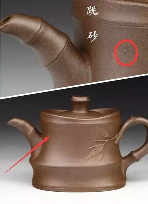 從這點(diǎn)來(lái)看,有跳砂現(xiàn)象的壺大多是純正的極品硬砂料。為了滿(mǎn)足外行人對(duì)"好看"的要求,消除跳砂現(xiàn)象,可以添加脂粉泥,雖然不會(huì)跳砂了,但泥料的品質(zhì)也大大下降了。