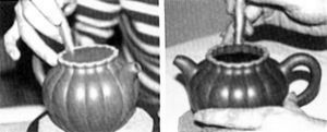 10、用脂泥粘接壺嘴、壺把、并用尖刀、明針加工清理。