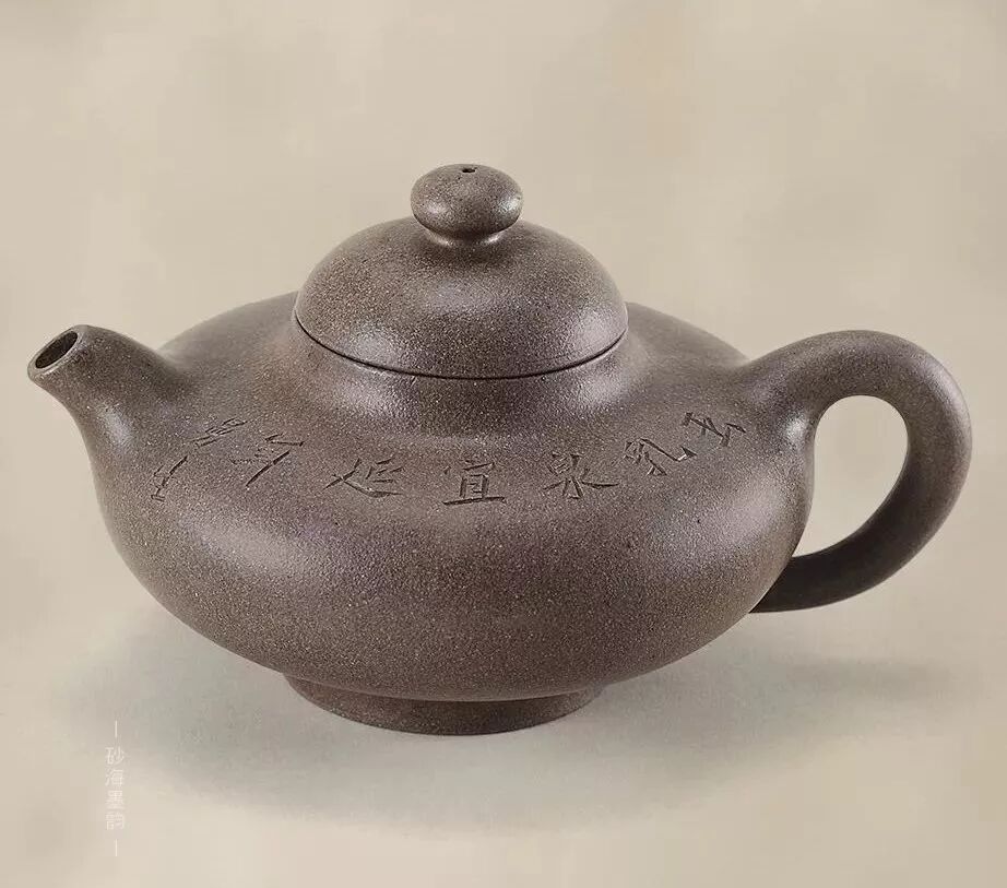 這款便是顧老所創(chuàng)制的華穎壺,此壺有掇球之形,作品把圓、蓋圓、壺身圓等多圓壘疊在圓壺底上,分外精神,遙望猶如花苞初綻。