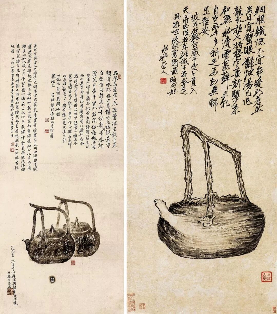 另一幅則為玉成窯制壺名家王東石所作的石銚提梁的拓本圖,壺拓于1930年代,為撰寫《陽羨砂壺圖考》的二位學人張虹、李景康收藏,并題跋其上。