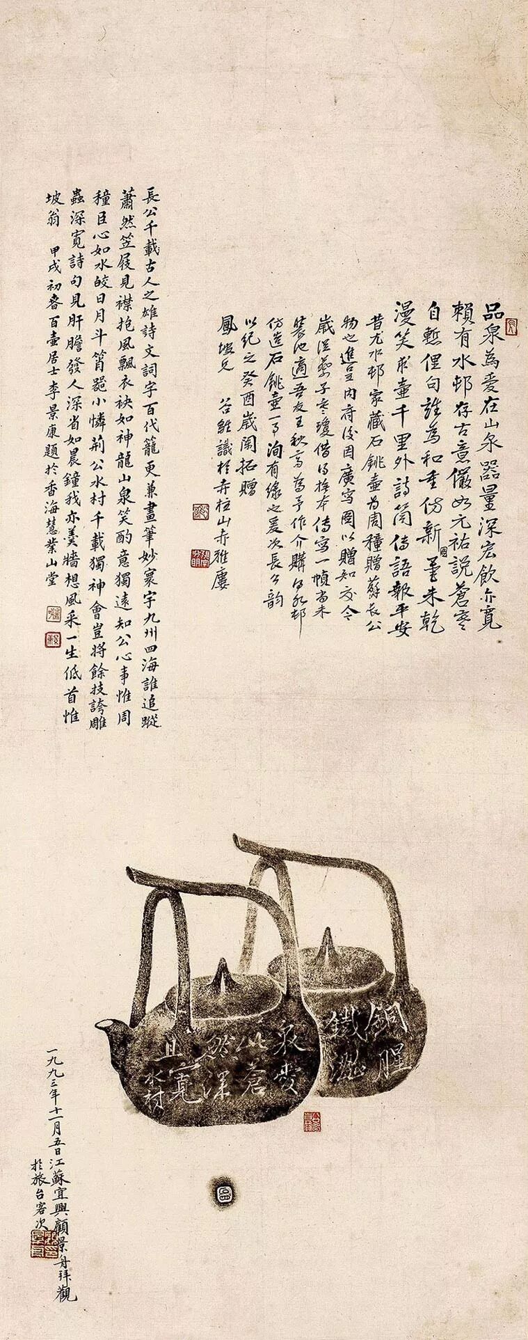 二圖被同一人收藏,裝池成對,并于裱邊長題,而更為珍貴的是,其上更有近當代紫砂泰斗顧景舟先生的題跋:「一九九三年十一月五日江蘇宜興顧景舟拜觀于旅臺客次?!?/span>