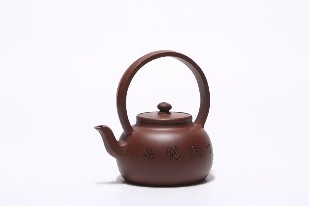 以圓形為基調(diào),正視,球狀壺身配以圓把提梁,使兩大圓輪廓線既相互交叉,又相互阻斷,從而使壺形的立體感更為強烈。