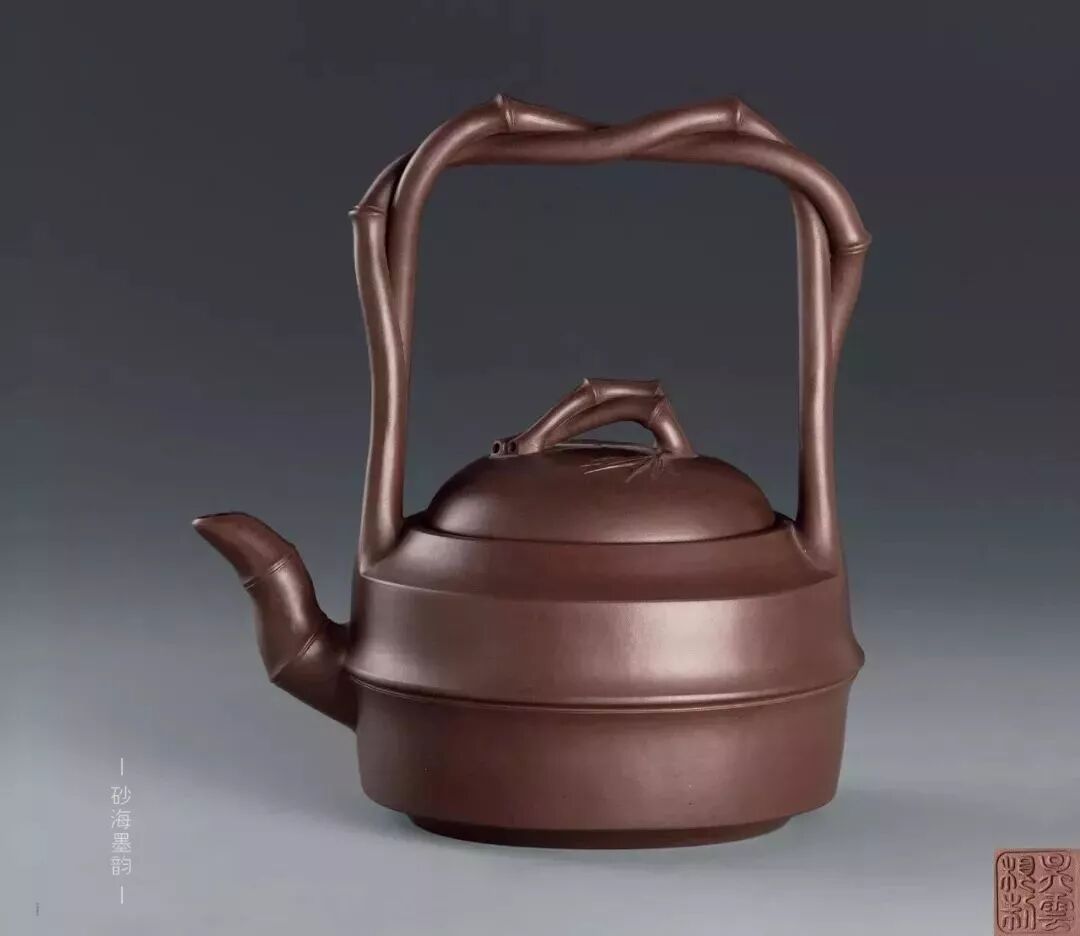 此壺是吳云根大師存世極少的杰作,同時也是創(chuàng)新之作。提梁以兩根竹枝纏合一起,既增加了提梁的強度,又使提梁沒有臃腫感,與身桶十分相搭。