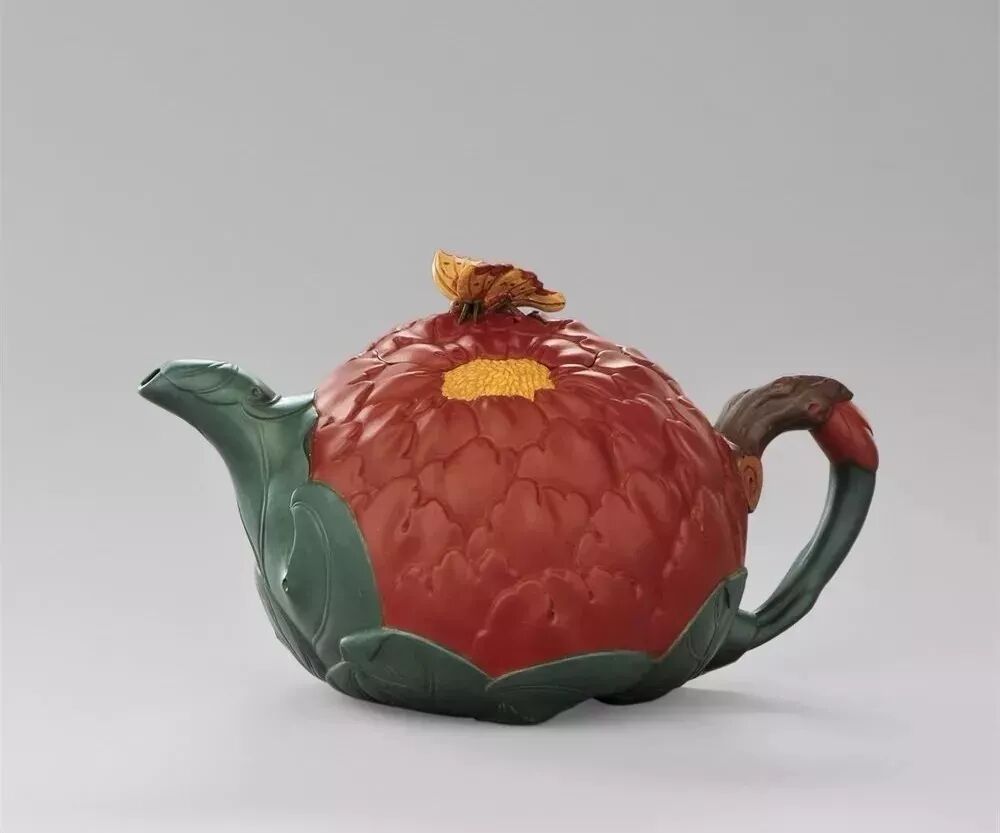 壺蓋則在花蕊側(cè)瓣開出嵌蓋,使花朵整體天衣無縫,一只欲停欲飛的彩蝶,點綴其上,既是裝飾,又是壺鈕。