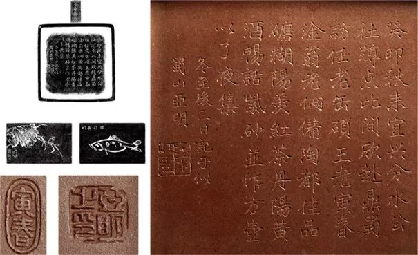 亞明在1963年曾赴丁山拜訪任淦庭與王寅春。酒酣茶罷,“作方壺以了夜集”。他親自設(shè)計繪制出此壺樣式,并交王寅春捏制壺形。