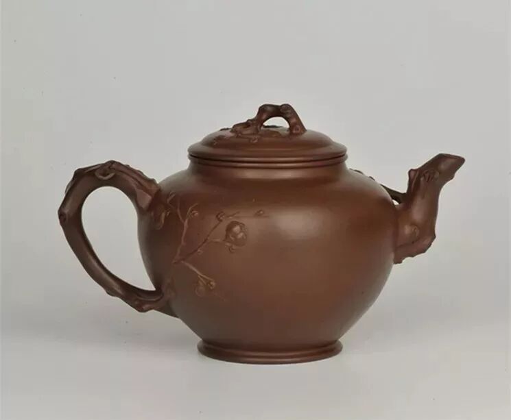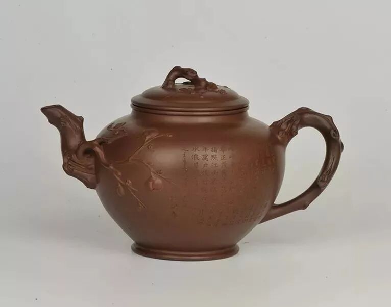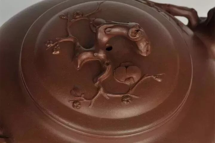 正面梅花枝梗作流,反面桃花枝梗作柄,壺蓋上梅花與桃花枝葉相擁成鈕,報春之意正濃。