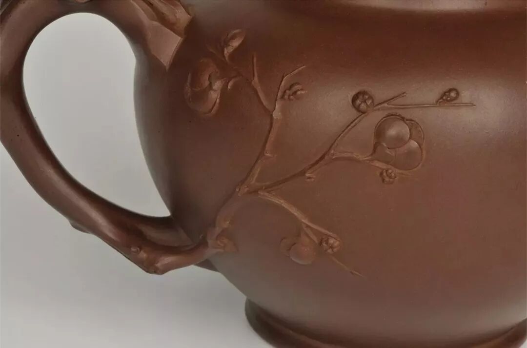 壺身呈雞心形,高足線,高頸,平口出唇。此壺的特別之處不僅在于其碩大的尺寸,更在于其將梅花與桃花兩類裝飾運用在同一把壺上。