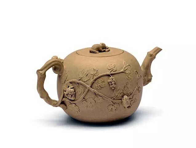 壺身正面為一副淺浮雕的松鼠葡萄圖,葡萄藤蔓莖葉于壺身繚繞,松鼠在期間嬉戲,畫面自然生動,妙趣橫生。