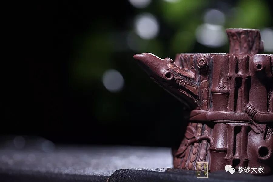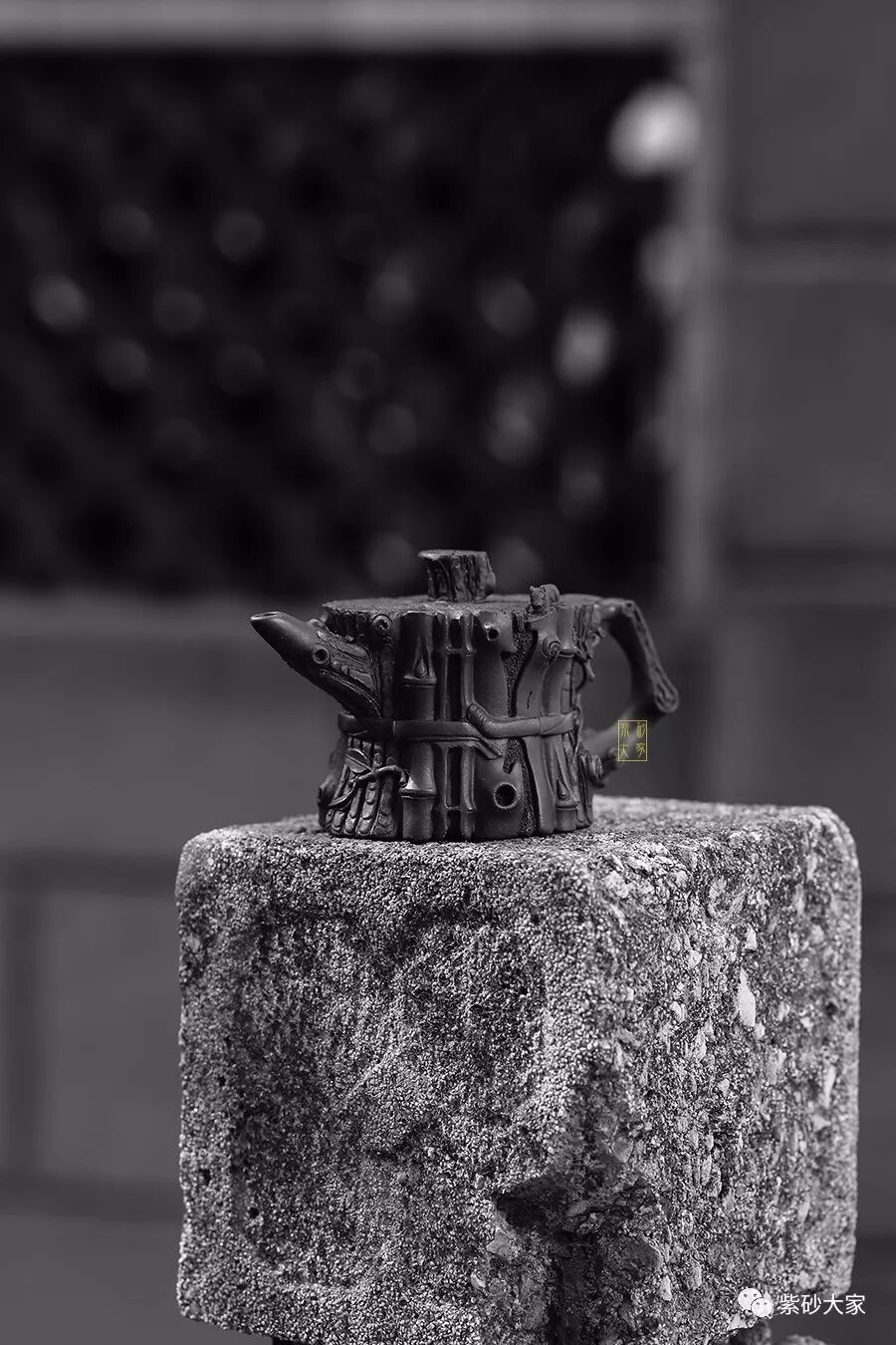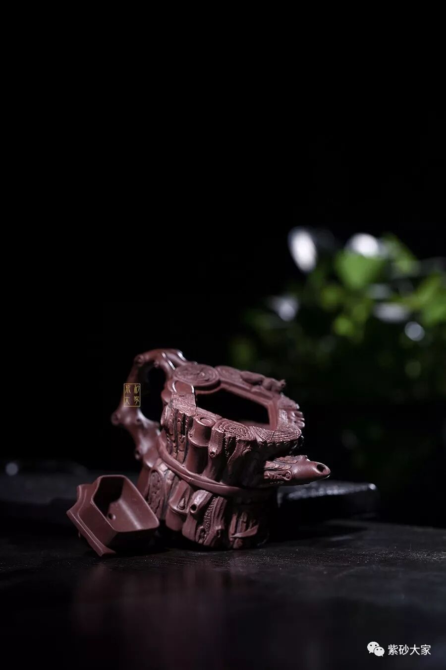 蓋紐又巧塑成一段松樁,更為絕妙的是,在樹(shù)干上,還塑有一只小松鼠。全器渾若天成,成為絕妙名壺。