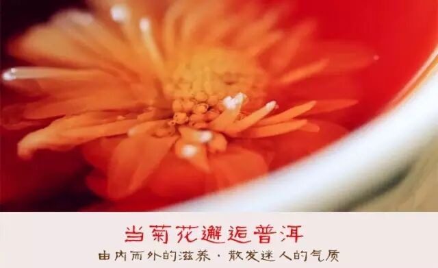 用普洱茶葉和貢菊,一起沖泡,口感清爽。菊花清熱解毒,普洱茶性溫和,兩者同時飲用,性能調和功效倍增。值得一提的是:菊花普洱茶尤其適合熱性體質的茶人朋友!