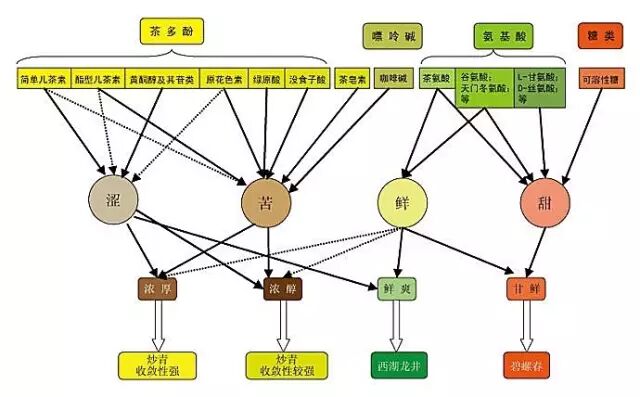 從科學(xué)上來(lái)說(shuō),茶湯中的呈味物質(zhì)歸納起來(lái)可分為:糖類、氨基酸、酚性物及其氧化產(chǎn)物(主要為茶多酚)、嘌呤堿(以咖啡堿為主)和茶皂素等。