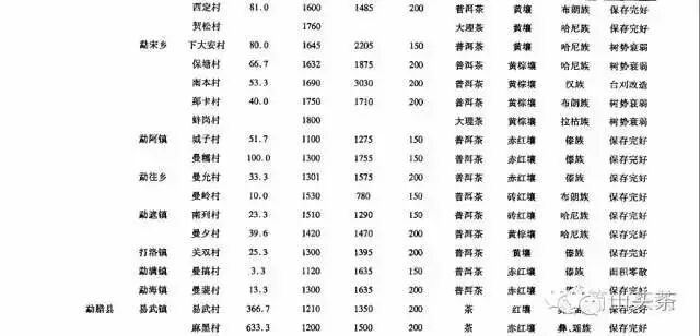 比如賀開曼邁村有4200畝,曼竜老寨1350畝,班盆村90畝古茶園,老班章4485畝,新班章村1380畝,老曼峨村3205畝。南糯山12000畝,易武倚邦2940畝……