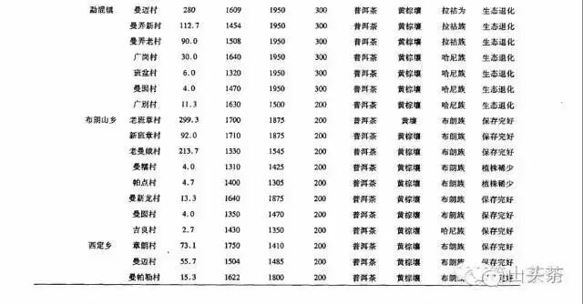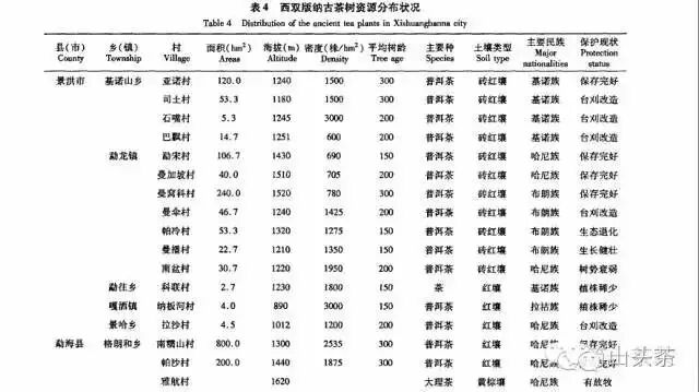 表4西雙版納古茶樹資源分布狀況(可點擊圖片查看大圖)。下圖單位為公頃,1公頃=15畝=100米*100米
