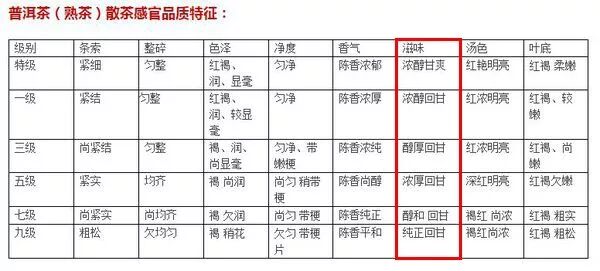 回甘生津在生茶的口感上表現(xiàn)更明顯,那是不是就說明回甘生津不會發(fā)生在熟茶里?事實上,根據(jù)國標(biāo)定義,普洱茶(熟茶)散茶的感官品質(zhì)特征里,也包括“回甘”一項,不同級別的熟茶對應(yīng)的“滋味”分項因子的要求為: