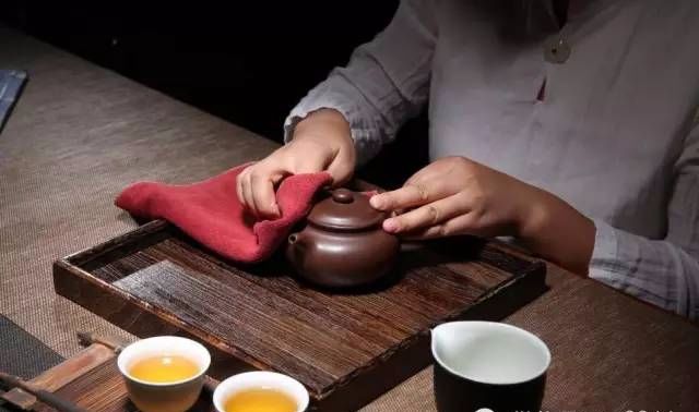 一般來說,在續(xù)水、倒茶,或換茶葉等品茶的種種準(zhǔn)備之際,用冷水浸 過的潔凈茶巾,在有意無意之間擦拭壺體。這是“內(nèi)養(yǎng)外護(hù)”的結(jié)合。