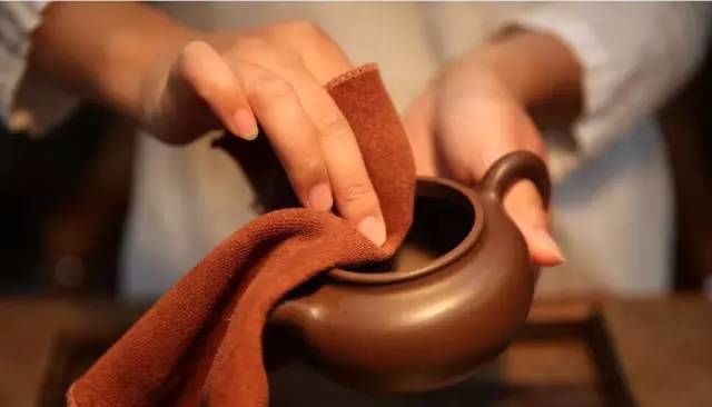 用濕茶巾擦拭壺體,一是有利于壺體的按摩;二是 有利于壺內(nèi)的茶汁增強(qiáng)穿透力,增加茶汁在壺體“空隙”中活動(dòng)、流動(dòng)的速度,頻率。