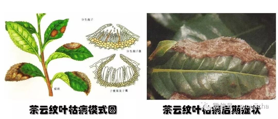發(fā)病時(shí),成葉和老葉上的病斑呈圓形或不規(guī)則形,初為黃褐色,水漬狀,后轉(zhuǎn)褐色,其上有波狀輪紋,最后由中央向外變灰白色,上生灰黑色、扁平圓形小粒點(diǎn),沿輪紋排列;嫩葉病斑圓形,褐色,后變黑褐色枯死;枝條上產(chǎn)生灰褐色斑塊,稍下陷,上生灰黑色小粒點(diǎn),最后枝梢回枯;果實(shí)病斑為圓形,黃褐色至灰色,上生灰黑色小粒點(diǎn),病部有時(shí)開(kāi)裂,促使樹(shù)勢(shì)衰弱。發(fā)生嚴(yán)重時(shí),茶園成片褐色,致使幼齡茶樹(shù)整株枯死。