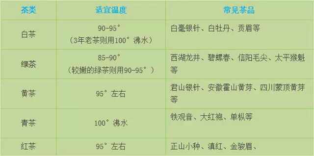 泡茶水溫的掌握,主要是看沖泡什么茶而定啦。而茶葉的嫩度和發(fā)酵程度的不同,沖泡的水溫也有所差別。所以,根據(jù)常見茶品的類別,小編總結(jié)出一個(gè)茶和沖泡水溫對應(yīng)的列表,這樣就可以一目了然了: