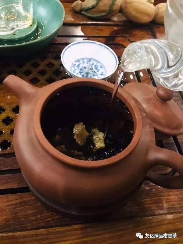 ④ 投茶:覺(jué)得口感最佳的出茶量為:6克普洱熟茶+2克陳皮,僅供大家品飲參考