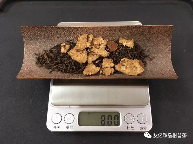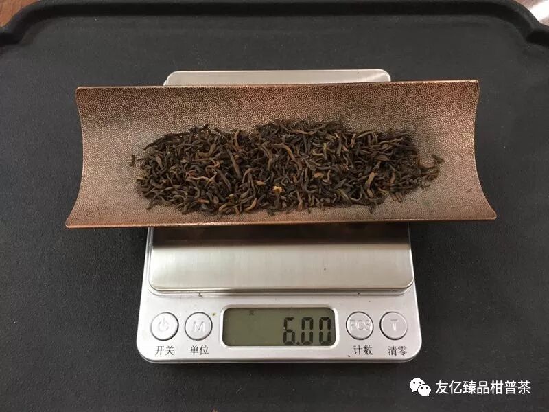 ②將柑普傾斜置于茶則,旋轉(zhuǎn)式倒出熟普,取茶6克